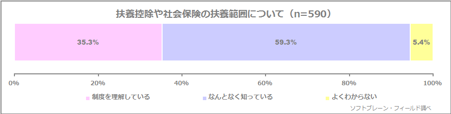 アンケートではまず、いわゆる「103万円の壁」、「130万円の壁」と言われる、扶養控除や社会保険の適用範囲について確認しました。その結果「制度を理解している」が35.3%、「なんとなく知っている」が59.3%、「よくわからない」が5.4%でした。