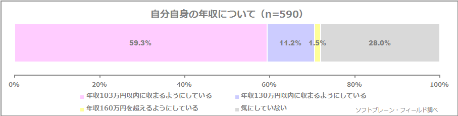 さらに、ご自身の年収が扶養控除や社会保険の適用範囲を超えないよう意識しているかを聞いたところ、「年収103万円以内に収まるようにしている」が59.3%、「年収130万円以内に収まるようにしている」が11.2%で、働く既婚女性の90%以上が扶養控除や社会保険の適用範囲について知っており、70%以上が「103万円の壁」や「130万円の壁」を気にしながら働いていることがわかりました。