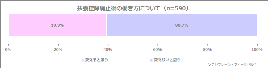 その一方で、もし扶養控除が廃止された場合、収入を増やすために現在の働き方から変えるかを聞いたところ、「変えると思う」が39.3%、「変えないと思う」が60.7%でした。