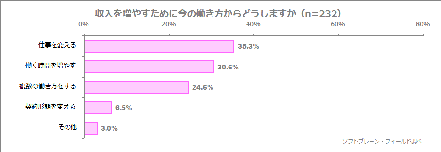 さらに、今の働き方を「変えると思う」と回答した232名に収入を増やすためにどうするかを聞いたところ「より収入の高い仕事に変える」が35.3%、「働く時間を増やす」が30.6%、「副業、ダブルワーク等複数の働き方をする」が24.6%、「派遣社員や契約社員から正社員へ等のように契約形態を変える」が6.5%、「その他」3.0%となりました。