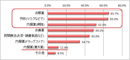 花粉症にかかったことがある329名のうち、5割以上の方が「病院での内服薬」、「マスクなどでの予防」、「点眼薬」を対策として実施しており、「お茶・健康食品などの民間療法」を上回りました。最近流行の漢方薬の活用は全体の12%にとどまりました。